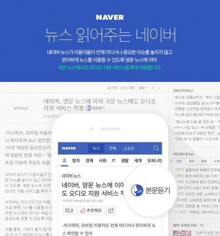 韓国大手ポータルサイトのNAVER(네이버:ネイバー)が、28日から韓国語のニュース(한국어 뉴스)を音声で読み上げるサービスを開始した。小さな画面でニュースを読むのがつらい人、歩行者、運転者らの利用を見込んでいる。ネイバー(네이버)は2013年、英文ニュースの読み上げサービスを開始した。このほど新たにスピードの調節が可能になり、通勤・通学中の英語学習にも役立ちそうだ。ネイバー(네이버)のニュースサイトでタイトル横の「本文を聞く(본문듣기)」ボタンを押せば、テキストが読み上げられる。ネイバー(네이버)の関係者は「ユーザーが正確な発音でニュースを聞けるよう、独自開発した音声合成エンジンを採用した」とし、今後もさまざまな機能を追加していく計画だと伝えた。